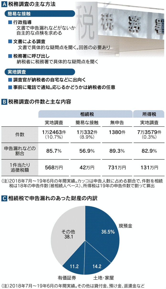 | Q :ある日、税務署から「お尋ね」されることがあります(通常は電話か手紙が来ます 申告が適正かどうかのチェック)「税務調査」です 「お尋ね」とは? 個人では主に「相続税調査」が例年8月ごろから年末にかけて本格化します 税務当局が調査などを通じて贈与税の適正な申告を求めた件数のうち 無申告の例が 例年 約80%にのぼり 1件当たりの追徴税額も200万円前後と多い |