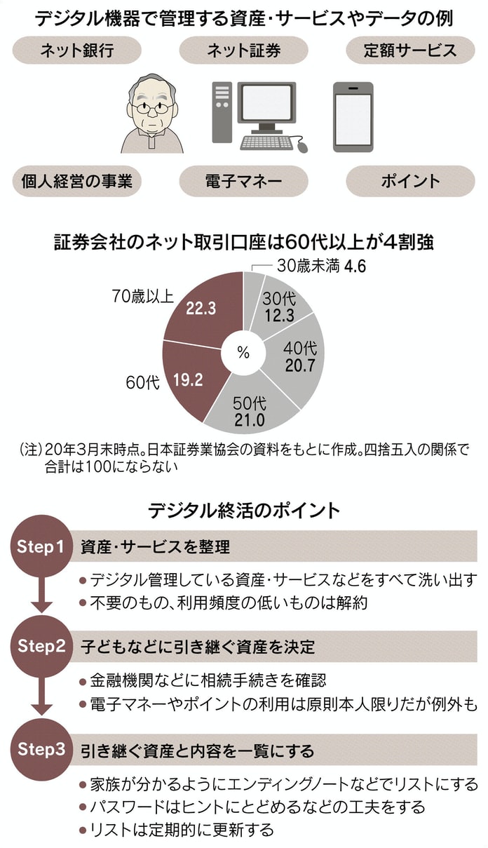 | ・デジタル機器で管理する(家族に話さず)外国為替証拠金取引(FX)や暗号資産(仮想通過)などリスクの高い金融商品を売買していた場合 死後に相場変動で損失が膨らんでいる場合もある ・サブスクリプション(定額課金・サブスク)サービス 死後も定期的に課金され請求が続く場合 |