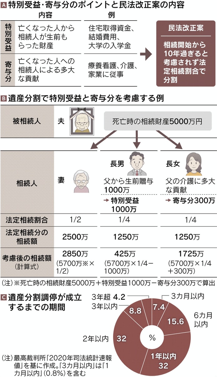 「特別受益」は原則的には遺産の先渡しとみなされるため、遺産分割の際に特別受益に相当する金額を相続財産に加えたうえで(=持ち戻して)、相続人それぞれの取り分を法定相続分により計算する