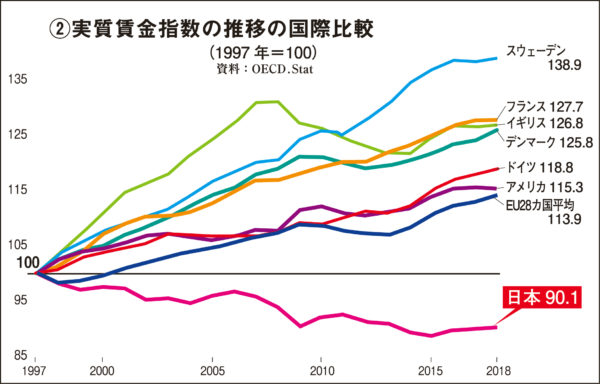 30年間という長いスパンで見ると、日本の「名目賃金」は驚くほど増えていない 30年間の名目賃金上昇率は日本は わずか4.4% 米は47% 英は44%等となっている 「実質賃金」(名目賃金から消費者物価指数を除したもの)となると