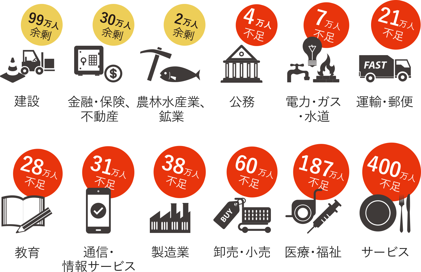 ・「少子高齢化」(生産年齢人口の減少)が進む日本は 「労働生産性」が低い中 2030年には多くの職業で人手不足の深刻化が予想され 全体では644万人の不足が見込まれる(下記表
