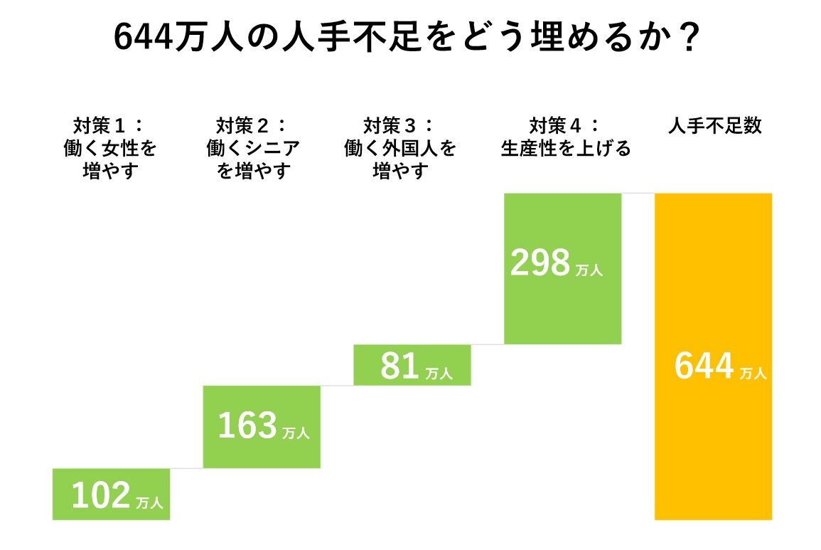 対策として 女性・シニアの労働参加を促すとありますが そうするには 短時間で効率よく働く 働く場所を縛らず移動や通勤の負担を軽減する 男女や年齢による賃金格差の解消