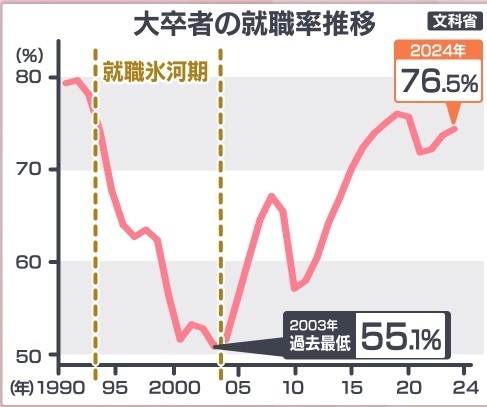 ・バブル経済崩壊後の雇用環境が厳しい時期 1993年 ~ 2004年頃に就職活動を行っていた人々(厚生労働省)