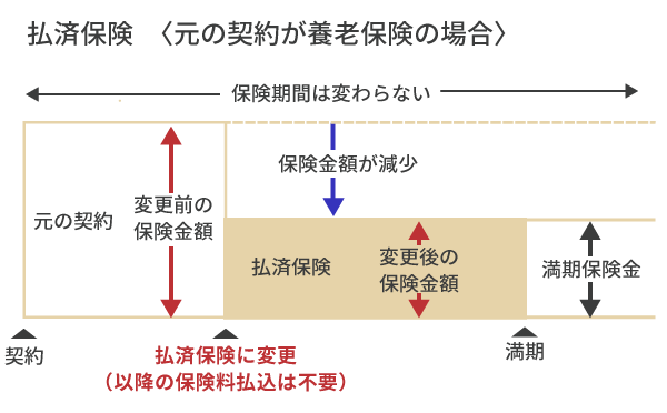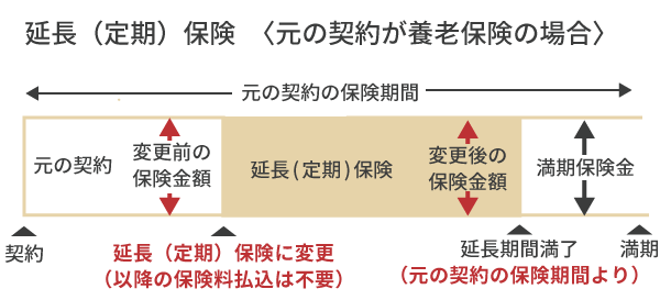 払済保険とは異なり、保障期間は通常短くなるが(保険期間は、その時点の解約返戻金をもとに算出)、保険金額は従来のまま