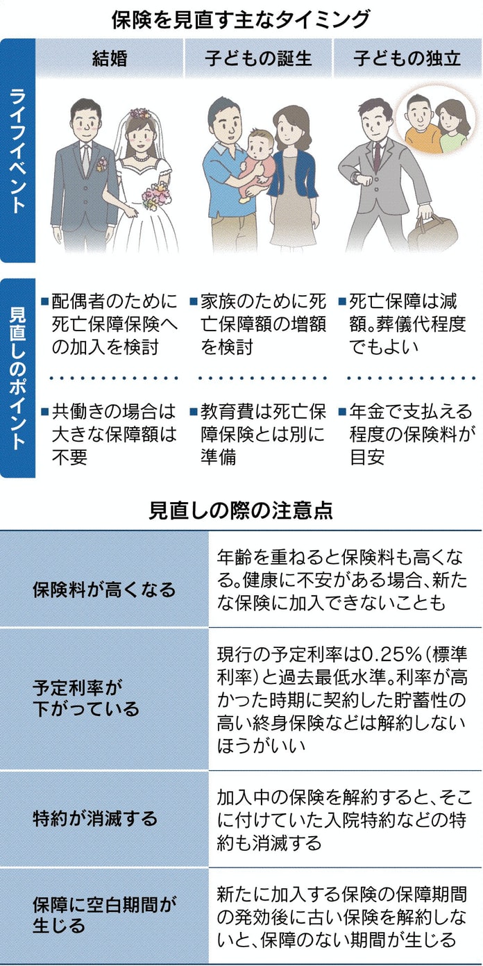 | Q:保険の見直しのタイミング ① 来年、子供が生まれる予定のため「保険の見直し」を検討しています 保険料が割高になったり補償内容が手薄になったりするのは避けたいのですが、どのようなことに注意すればよいですか? |