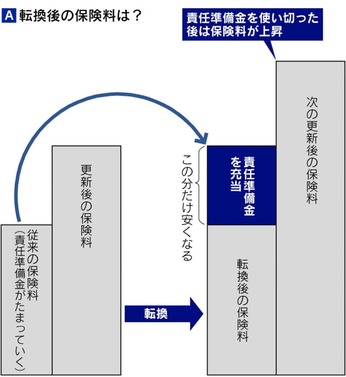 転換が行われるとき、保険会社は保険料を基にそれまで積み立ててきた積立金(責任準備金*)を、転換後の保険料に充てることで、安くしていることが多い