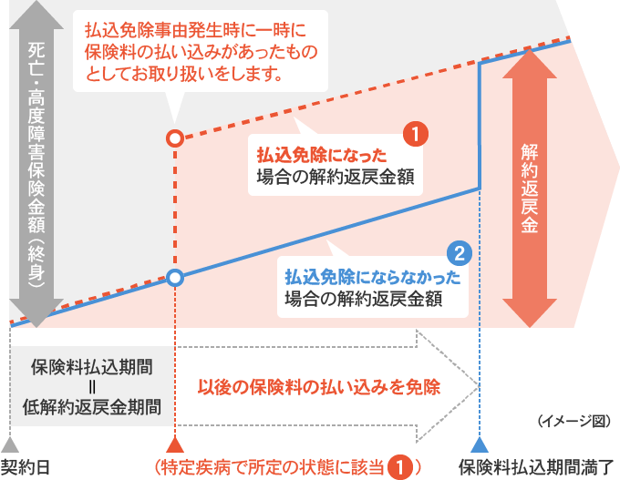 ・ある一定の要件(適用される範囲・所定の状態)を満たした場合に それ以降の保険料支払いが免除されるという特約(保障は継続される)