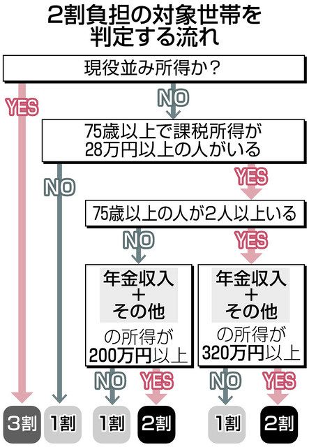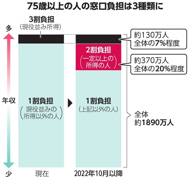 → 単身なら年収200万円以上、複数人世帯なら75歳以上の年収合計が320万円以上あれば負担割合を1割から2割に引き上げへ(75歳以上の20%にあたる約370万人が対象に)
