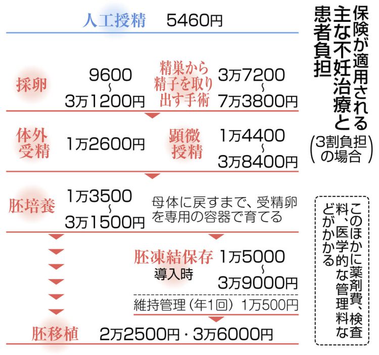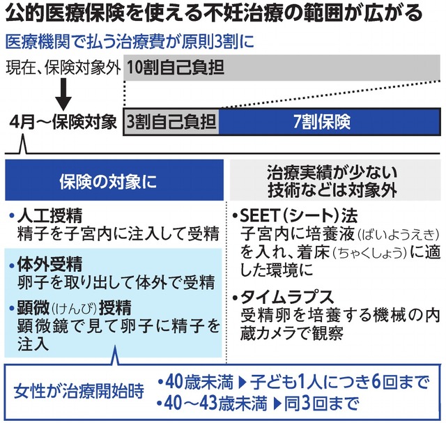 | ・人工授精や体外受精 / 顕微受精の基本的な治療が保険適用に 体外受精の保険適用の条件は 原則女性が43歳未満の場合 40歳未満は 1子ごとに6回 40歳以上は 1子ごとに3回という回数の制限がある(制限回数を超えた治療は保険適用外) 年齢や回数に制限があるのは 生殖補助医療(体外受精や顕微受精等)のみで 一般不妊治療(タイミング法や人工授精)には 年齢・回数の制限はない また 男性には 年齢・回数の制限はない ・不妊治療の内容は 人により異なり 保険対象とならない治療も多い 保険内の治療で成功しなかった場合に 保険適用外の治療に取り組むことも多い 「先進医療」として認められた治療は 保険適用分に先進医療の治療費を上乗せできる 保険診療でも先進医療でもない治療(例えば 着床前診断(流産を防ぐため受精卵の異常を調べる検査))を取り入れると一連の治療費は全額自己負担に 「若い患者の大半の治療は保険診療と先進医療で対応できる」「治療開始が早いほど(若いほど)妊娠しやすい」 ・保険適用前は 「特定不妊治療」と呼ばれる体外受精や顕微授精を対象に 1回15万円(初回は30万円)の国の助成制度があったが 3月末で終了 地方自治体では 独自の助成を設ける動きがある(保険適用前から 金額や回数を上乗せしていた自治体もあった) |