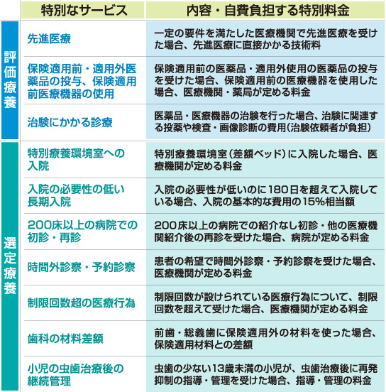 | 国が定める高度の医療技術を用いた療養のうち 公的医療保険の対象になっていないもの(評価療養のひとつ)(安全性と有効性が公的に確認されていない) 一般的な保険診療を受けるなかで 患者が希望し 医師がその必要性と合理性を認めた場合に行われる 併用する場合 先進医療部分は自費(高額療養費制度の対象外) 組み合わせる公的保険対象部分の自己負担は3割に抑えられる(保険外併用療養費制度のひとつ) |