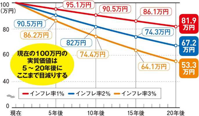 2%のインフレが続くと お金の価値は 20年後に2/3に減る