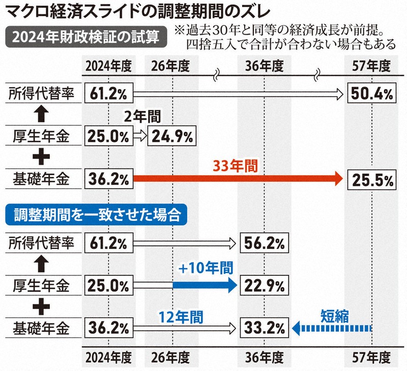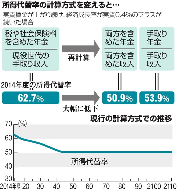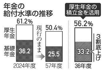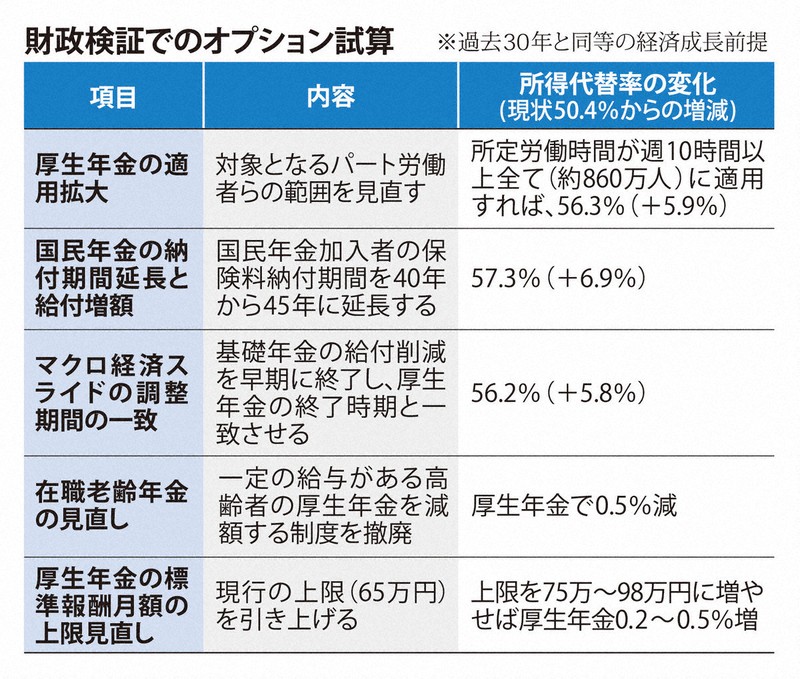 中長期の実質経済成長率が0.7%減のケースでは59年度に国民年金の積立金が枯渇し 所得代替率は30%台に低下 一方 経済成長率が1%以上と見込む2ケースでは56.9~57.6%で下げ止まる
