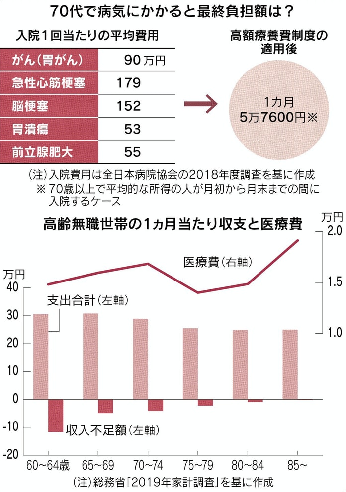 ・65歳以上の人で入院の多い3大疾病は 「脳血管疾患」 「がん」 「心疾患」 このうち、入院期間が長く治療費がかさむのが「脳梗塞」(平均入院日数が100日以上、入院費は300万円前後にも)