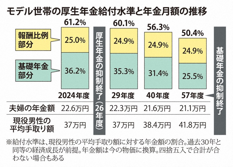 所得代替率は61.2%(2019年では 61.7% 悪化している)前回の2019年に比べて低下率が縮小する傾向だが 高齢者と女性の就労参加が進んだことや
