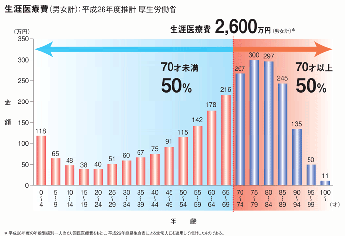 ●ひとりの人が生まれてから亡くなるまでにかかる医療費「生涯医療費」(自己負担+医療保険)は、約2.600万円 その約半分は70歳以上の時期に占める(厚生労働省)