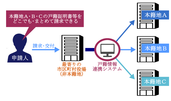・そこで全国の市区町村と法務省をつなぐ「戸籍情報連携システム」が稼働 利用者が自分の居住地など最寄りの役場で申請すると 例えば 故人(被相続人)の出生時・転居時・死亡時の本籍地の役場から戸籍謄本をまとめて入手できるようになった(相続手続きの書類収集にかかる手間や時間が軽減され