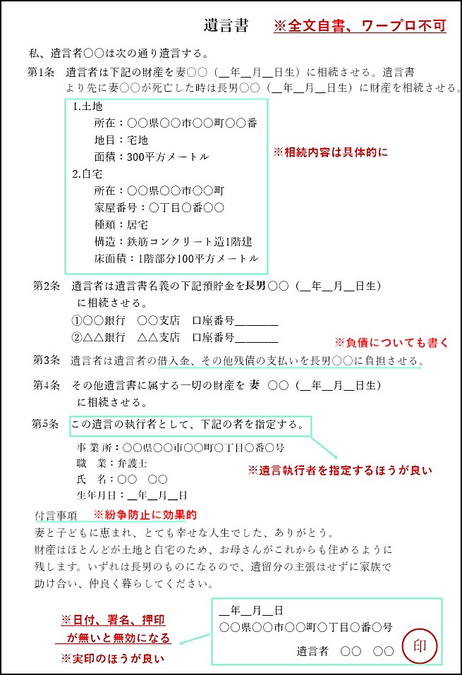 ・公証人が関与するので条件を満たさずに無効になることがない ・紛失 偽造 隠匿 発見されないというリスクがない ・出向けない場合 出張サービスがある ・家庭裁判所での検認が不要 |