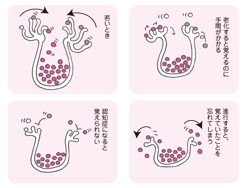 ・脳が老化すると 血液中の栄養を脳の細胞に取り込む力が弱まり 脳の代謝が滞る → 脳の老廃物が蓄積する → アミロイドβやタウ レビー小体などの異常タンパク質が蓄積し認知症に