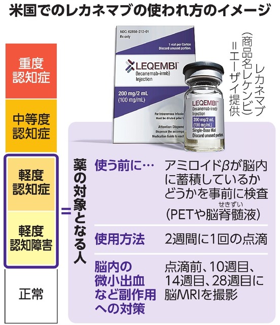 | ● 持病があると 病気によっては 薬の投与ができないこともあり 誰でも使えるとは限らない ● 早期アルツハイマー病の時期に投与しないと効かない 脳にアミロイドβがないと働かない ● 薬・抗体を体に点滴することで起る副作用として 発熱・呼吸困難・アレルギー反応などが26.4% 薬の点滴は続けることで ある種の脳浮腫12.6% 脳内出血などが17.3%確認された ● 厚生労働省の中央社会保険医療協議会(中医協)健康保険での使用を了承(2023年12月13日)レカネマブの薬価は 1バイアル当たり200mgが4万5,777円、500mgが11万4,443円。 2週間に1回投与するため、500mgを1年間(26回)投与した場合の薬剤費は1人当たり約298万円となる(体重50キログラムの人が1年間使った場合)治療に対応できる施設が少なく 患者の自己負担額は年齢や所得に応じて1割から3割となるため 年間29万円から89万円程度とされる |