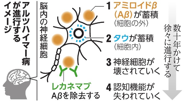 | 「脳内で生成されたタンパク質が分解された「アミロイドβ」の長年に渡る蓄積が脳細胞を死滅させ アルツハイマー病を引き起こす」 (近年のアルツハイマー病研究の有力な仮説) |