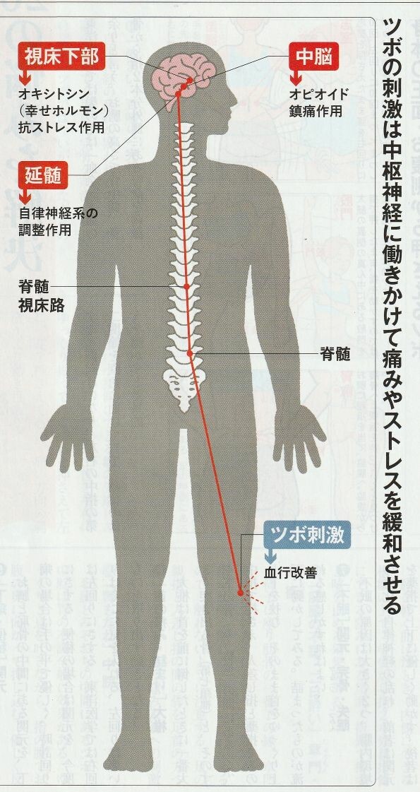| ・ツボを刺激すると →その情報が末梢神経から脊髄と脳にある中枢神経に伝達され 脳内で「オピオイド」という鎮痛物質が分泌される →脳内で自律神経の乱れを改善する幸せホルモン「オキシトシン」が分泌され 不安・ストレス・絶望感を鎮静する効果が得られる |