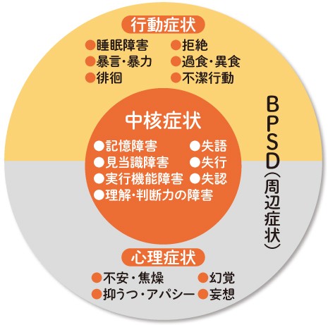 | 行動・心理症状(BPSD) | 中核症状によって引き起こされる二次的な症状 以前は「周辺症状」と言われることが多かった(行動・心理症状を表すBehavioral and Psychological