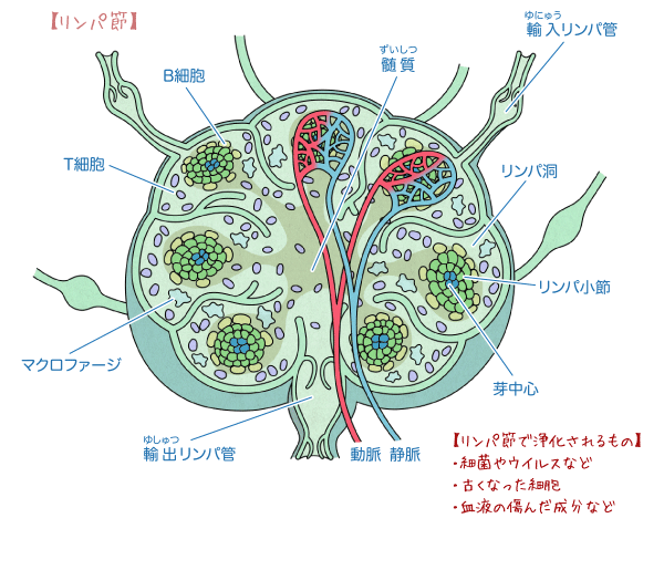 | リンパ節 | ・免疫細胞が集合しており、リンパ液を濾過して不要なものを除去している リンパ管の途中にある「フィルター」リンパ液の浄化と免疫細胞の活性化を行う ・毛細リンパ管として始まってから静脈に注ぐまでの間に リンパ管は何度も合流を繰り返すが 合流する部分にあるのがリンパ節 ・リンパ節には、リンパ球などの免疫細胞が集まっており(多くは白血球の仲間)リンパ球はリンパ管の中を流れながら、全身を巡り、細菌や有害物質に備えている 異物の侵入を確認すると リンパ節では これらの異物が血液循環系へ侵入するのを防ぐべく 免疫細胞が戦う 免疫細胞が異物を攻撃、破壊し、食べつくしてくれるため、リンパ液はきれいな液体となって、流れていく(リンパ節から出たリンパ管はさらに合流を繰り返し、静脈に注ぐまでの間に数千にも及ぶリンパ節を通過していきます ・リンパ節の働きが悪くなり、老廃物や余分な水分の回収がうまくいかないとなると リンパ節を押したときに痛みが出たり 周囲がむくむ このような状態が続くと、体の免疫機能が衰え、風邪がひきやすくなったり、なかなか病気が治らないことも |