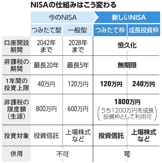 | 「つみたてNISA」を基本にした制度に一本化 ・「つみたてNISA」をメインとし「成長投資枠」(「一般NISA」機能引き継ぎ)を設ける ・対象年齢を未成年者まで広げ「ジュニアNISA」を引き継ぎ |